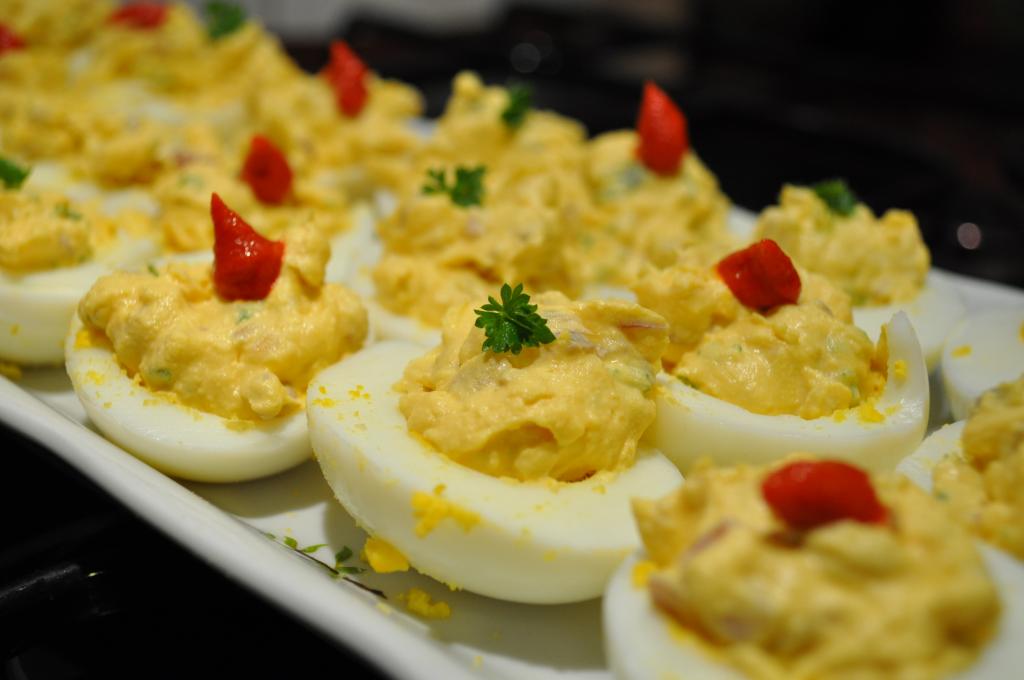 - A kapott masszát visszatöltjük az üregekbe és a megtöltött tojásokat egy tálra helyezzük a levágott felükkel lefelé. A bevonathoz elkészítjük a sűrű tartármártást és a tojásokra öntjük.