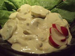 - A felszeletelt, vagy negyedekre vágott tojást az öntettel leöntjük, vagy hígabb majonézes öntettel (ha szükséges higítás pl. ecetes uborkalével, vízzel) óvatosan összekeverjük.