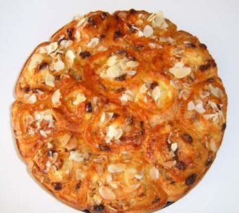 5. Szilikon ecset használatával a kalácsokat felvert tojással megkenjük, tetejükre szeletelt mandulát szórunk. Forró sütőben kb. 25 percig (függ a mérettől) sütjük.