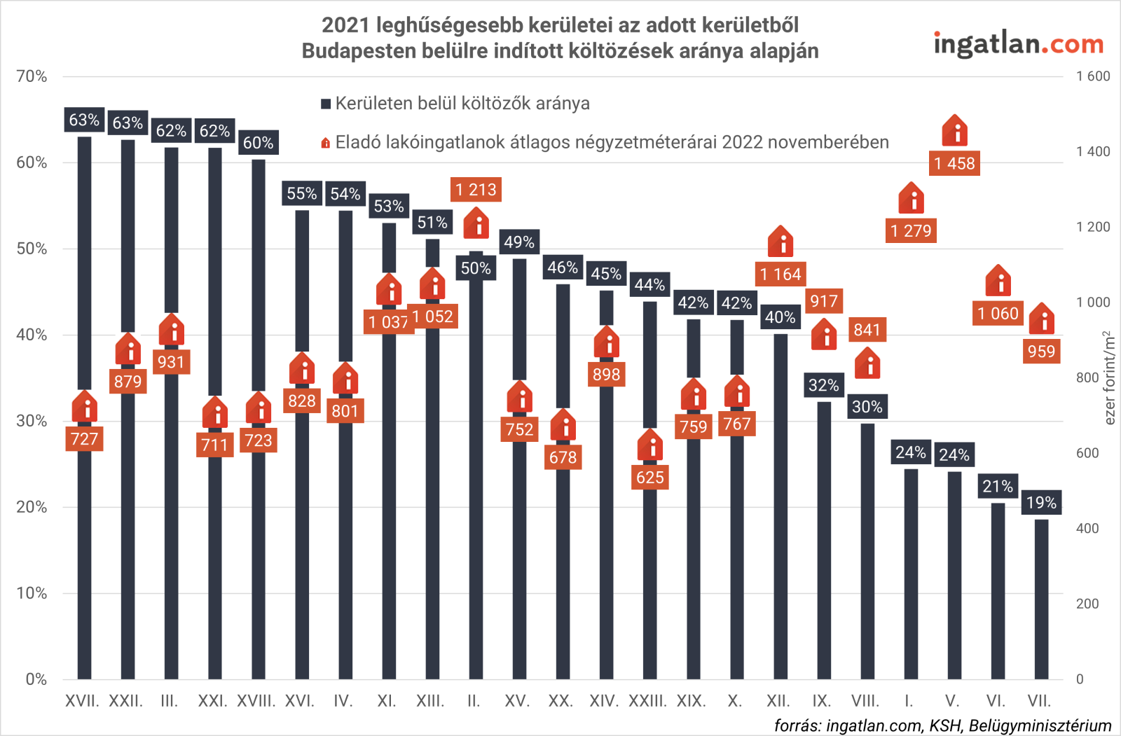 A fővároson belül költözők közül a XVII., a XXII., a III. kerületiek és a csepeliek voltak a leghűségesebbek a városrészükhöz. Ezekben a kerületekből a Budapesten belülre költözők 62-63 százaléka maradt kerületen belül. Az ingatlan.com szakértője szerint a budapesti népszűréségi listát nagymértékben meghatározza, hogy a peremkerületekben kedvezőbbek ingatlanárak, és az ott található lakások és házak az átlagosnál nagyobb alapterületűek.