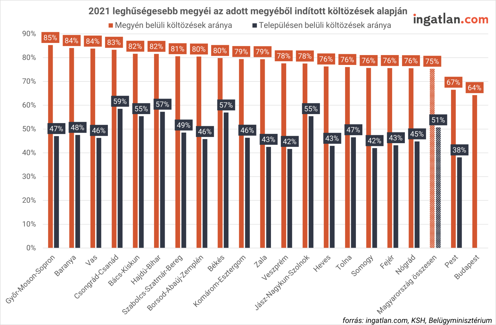 Az egyes megyékből indult költözések alapján kirajzolódnak 2021 leghűségesebb megyéi is. Az állandó lakhelyet váltó költözők közül a legnagyobb arányban (85%) Győr-Moson-Sopron megyében találtak új otthonra a megyén belül. A nyugati határmegyét Baranya és Vas megye követi 84 százalékkal. Csongrád-Csanád megyében a költözők 59 százaléka településen belül váltott lakhelyet, ami a legmagasabb arány a megyék rangsorában. Hasonlóan magas a településen belül költözők aránya Hajdú-Bihar és Békés megyében is, ahol az elköltözők 57 százaléka maradt az adott településen belül.