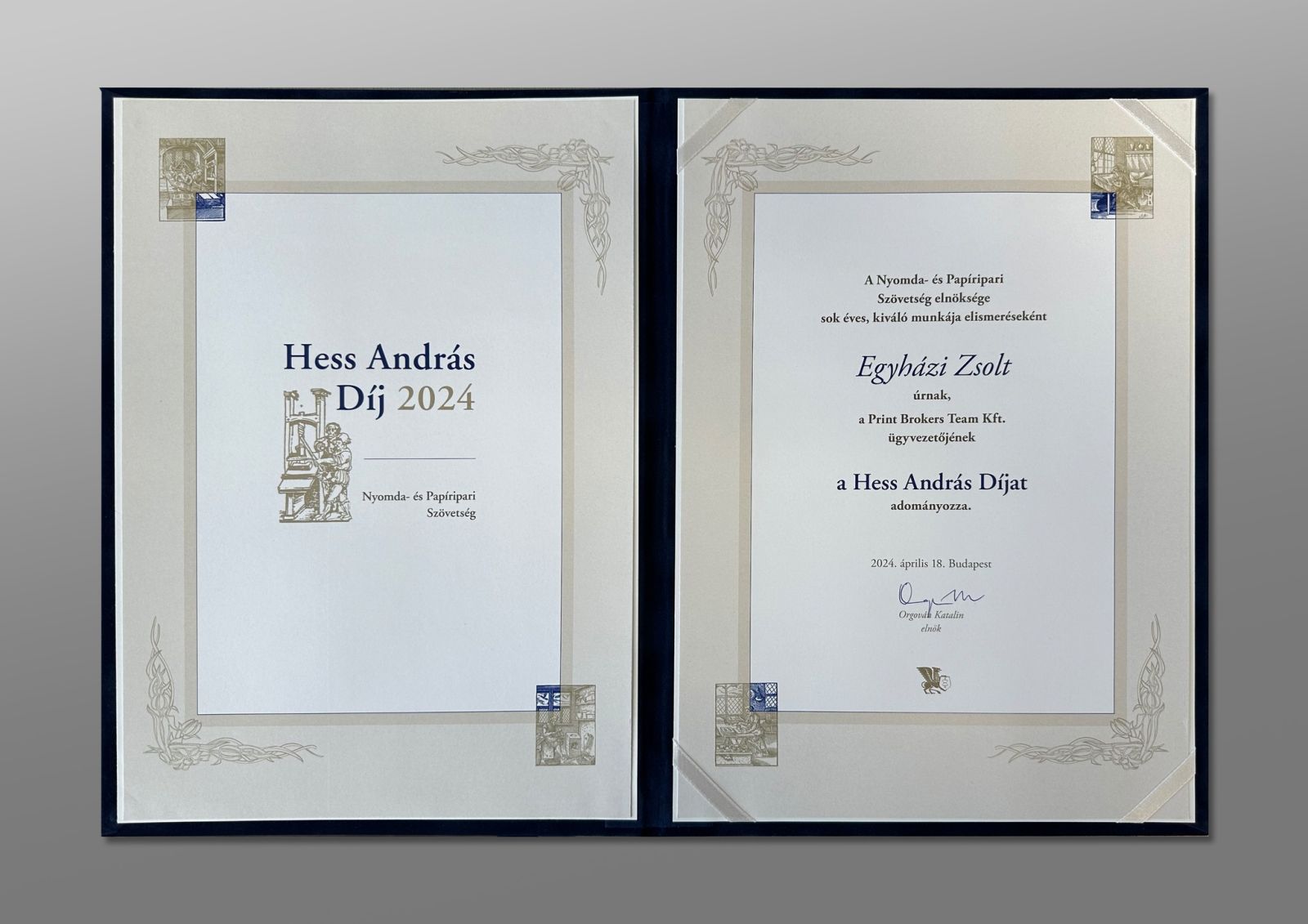 Egyházi Zsoltot kollégái terjesztették fel a Nyomda- és Papíripari Szövetség Hess András díjára. Évről évre azok a kiemelkedő munkát végző szakemberek kapják meg ezt a díjat, akik tevékenységükkel hozzájárulnak a hazai nyomdaipar eredményeihez, az iparági innovációkhoz.