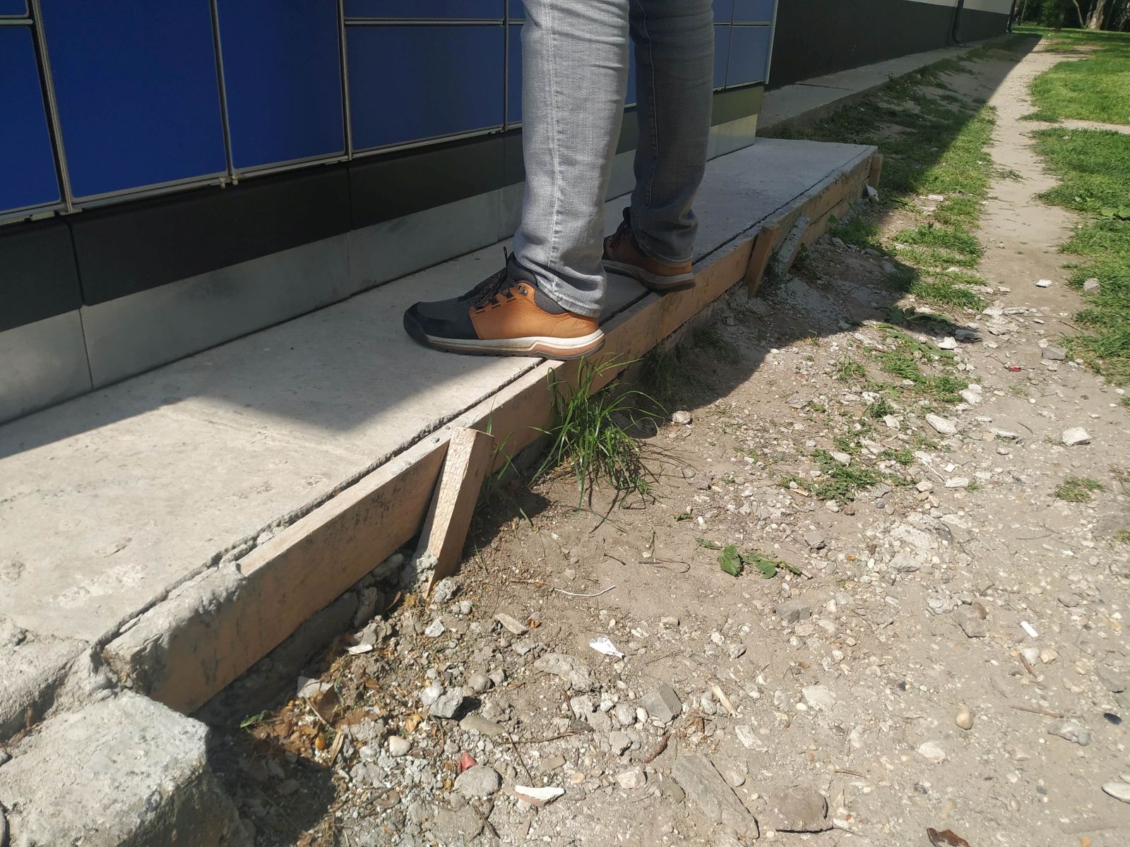 A fotókon jól kivehető, hogy az automatát használók egy szűk betoncsíkon állhatnak, míg a csomagok feladásával, átvételével kapcsolatos ügyeiket intézik. Ez nem is lenne talán probléma, ha a betoncsík mellett nem egy közel 20 centiméter magas, bokatörő szintkülönbség fogadná a gyanútlan őket. Egy rossz lépés, és máris csonttörés a vége.
