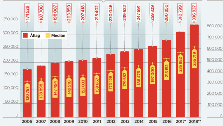 Szalai Piroska munkaerőpiaci szakértő, a Budapesti Vállalkozásfejlesztési Közalapítvány kuratóriumi elnöke a lapnak kifejtette: a medián az az összeg, amelynél kevesebbet pontosan ugyanannyi munkavállaló keres, mint amennyien többet; 2018-ban ez bruttó 255 719 forint volt becslése szerint. A medián 67 százalékkal volt magasabb az idei első fél évben, mint 2010-ben, míg az átlag csak 60 százalékkal nőtt - írta a lap hétfői számában.