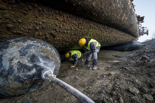 A 300 tonnásra becsült tömegű hajó mozgását az erre a célra készített felfújható ballonok segítik, amelyeken gördülni tud a test.