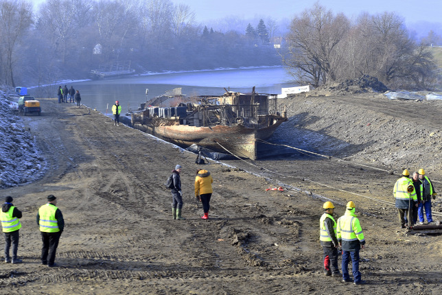 Heizler Tamás, a helyszínen a munkálatokat végző MA-HARD Vízépítő Kft. ügyvezetője azt mondta, az erősen megrongálódott hajótestet több mint 80 métert vontatták csörlők és egy Magyarországon először itt alkalmazott csigasor segítségével.