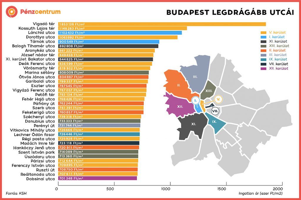 Az Ingatlanadattárban szereplő tranzakciók alapján megállapítható, hogy a fővárosban jelenleg az V. kerületi Vigadó tér a legdrágább, a bő 1,8 millió forintos négyzetméterár több mint 700 ezer forintot ver rá a 2. helyezett, amúgy szintén belvárosi Kossuth Lajos térre; illetve bő 750 ezer forintot a 3. helyezett Lánchíd utcára (I. kerület).