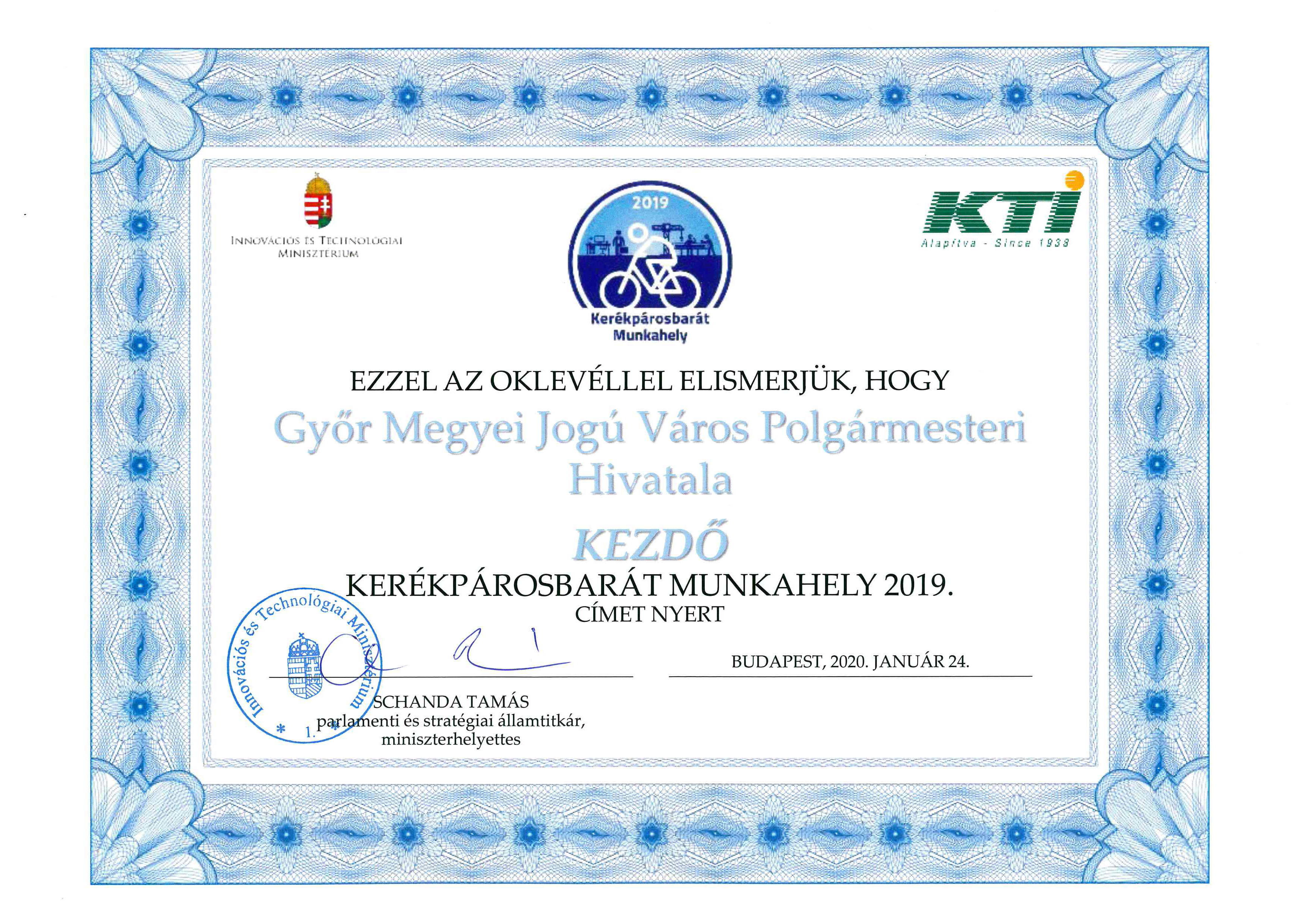 Győr Megyei Jogú Város Polgármesteri Hivatala sikerrel pályázott a „Kerékpárosbarát munkahely 2019” címre, amelynek kezdő fokozatát el is nyerte.