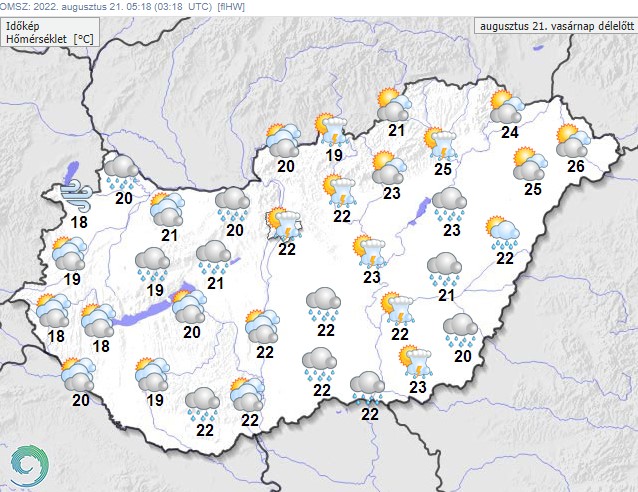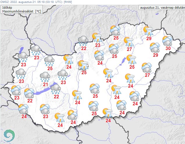 Általában erősen felhős vagy borult idő várható, de kisebb-nagyobb szakadozások időszakosan előfordulhatnak vasárnap (augusztus 21.) – írja az Országos Meteorológiai Szolgálat.