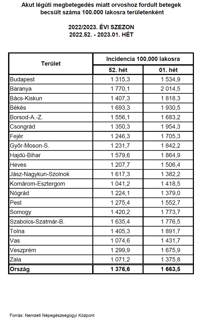 Az országos tisztifőorvos közölte: az akut légúti megbetegedések 20 százalékkal, az influenzaszerű megbetegedések pedig 50 százalékkal emelkedtek az év utolsó hetében mérthez képest.