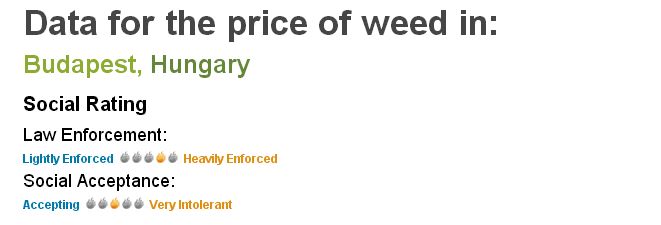 Az oldal nem áll meg itt. Rengeteg nélkülözhetetlen információt tartalmaz kicsiny országunkról. Megtudhatjuk azt is mennyire csípi az adott hely hatósága, a csóró, pénztelen személyeket, akik tudnak annak is örülni ha csak egy cigijük van, amit közösen szívnak el. Az oldal szerint Budapesten, csak okosan, mert nem túlságosan toleránsak. Továbbá a társadalmi elfogadottságát is méri az oldal, itt azért már jobb, közepes értékelést kaptunk!