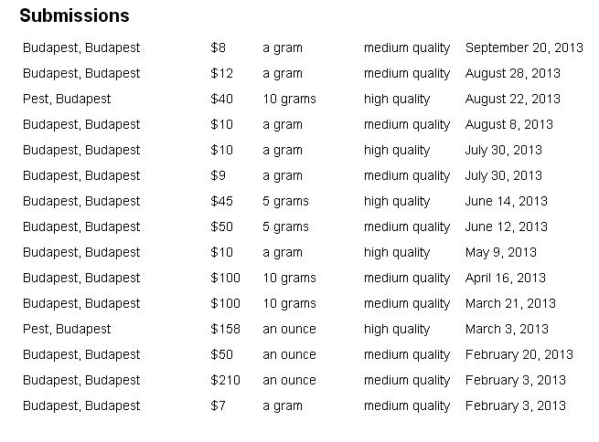 Visszatérve az árakra, listázza nekünk, a vásárlói véleményeket. Az adatok alapján elég vegyes a piac a fővárosban. A legutolsó bejegyzés itthonról, szeptember 20-án érkezett az oldalra, miszerint valaki 8 dollárért vásárolt ( mai árfolyamon az kb 1.700 Ft ) 1 gramm közepes minőségű mariskát. Az előtte lévő vásárló már kevésbé volt szerencsés, ő ugyanekkora mennyiségű és minőségű motyóért, 4 dollárral többet ( ~ 850 Ft ), tehát 150%-os árat fizetett.