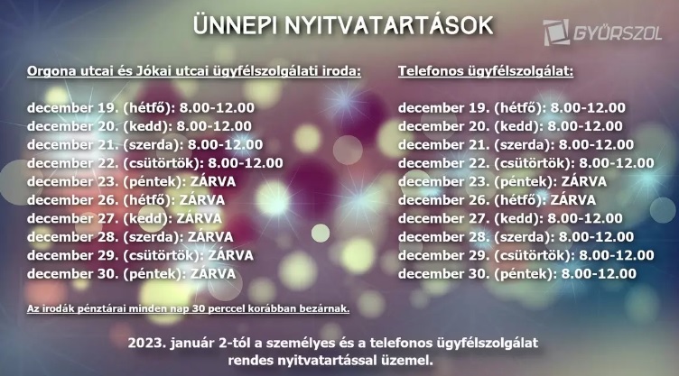 A tájékoztatás szerint a Győr-Szol Zrt. Orgona utcai és Jókai utcai ügyfélszolgálati irodái december 23. és 30. között zárva tartanak.