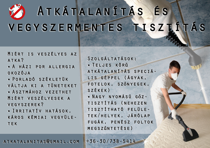 - Teljeskörű atkamentesítés speciális géppel ( szőnyegtisztítás, foteltisztítás, matracok tisztítása, székek tisztítása )
