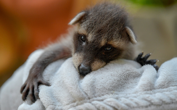 A Debreceni Állat- és Növénykert július 1-jén született Simon nevű mosómedvéje (Procyon lotor) a sajtóbemutatón július 31-én.