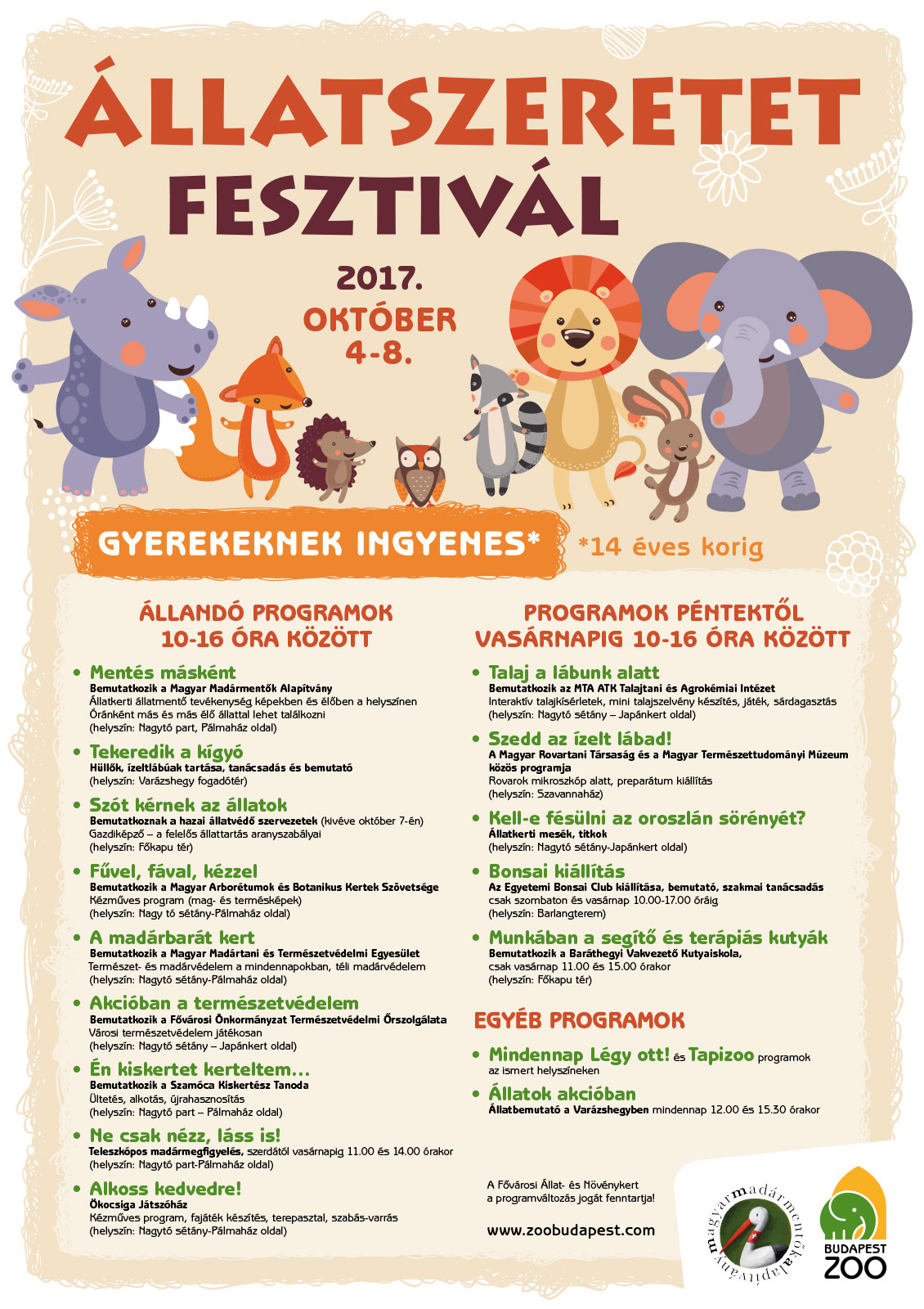 Állatszeretet Fesztivált rendeznek a Fővárosi Állat-és Növénykertben, 2017. október 4-8. között.