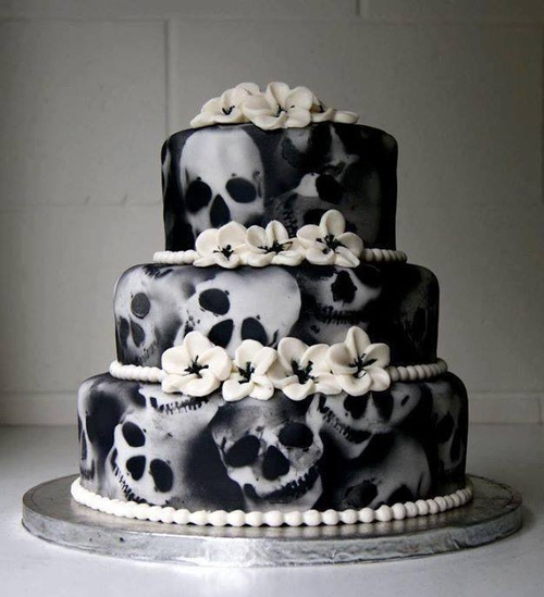 A halálfejek a virágokkal elég kontrasztos megoldás, valószínűleg egy keményebb csaj kapta. A virágok talán azért kerültek a tortára, hogy őrizzék a nagyszülők és a kisgyerekek nyugalmát.