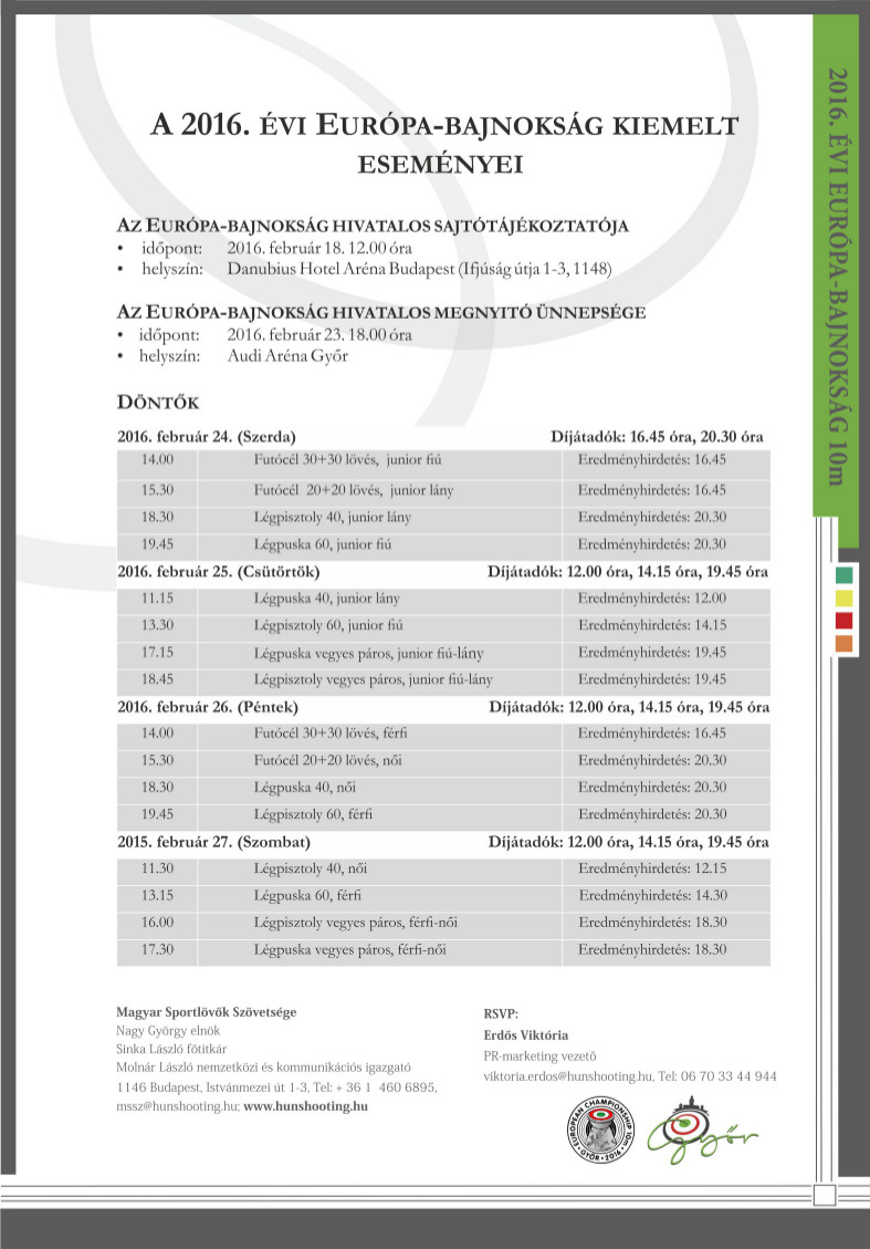Városunk a napokban egy újabb rangos versenynek ad otthont. A 2016-os Sportlövő Európa-bajnokságot február 23-27. között Győrben, az Audi Aréna Győr és a Magvassy sportcsarnok épületében rendezik.