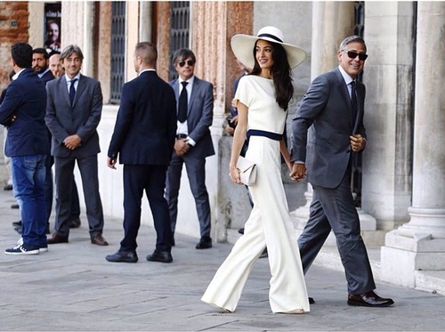 Áprilisban jött a hír, hogy George Clooney el is jegyezte Alamuddint, legalábbis látták őket a malibui Nobuban vacsorázni, ahonnan a nő egy nagyon eljegyzési gyűrűnek tűnő ékszerrel az ujján jött ki. Szeptember 27-én pedig kimondták a boldogító igent. A szombati esküvőt a Canale Grandéra néző Aman luxusszállodában tartották meg. A menyasszony Oscar de la Renta-ruhát viselni, hétkarátos aranyból készült jegygyűrűje több mint 500 ezer euróba (157 millió forintba) került.