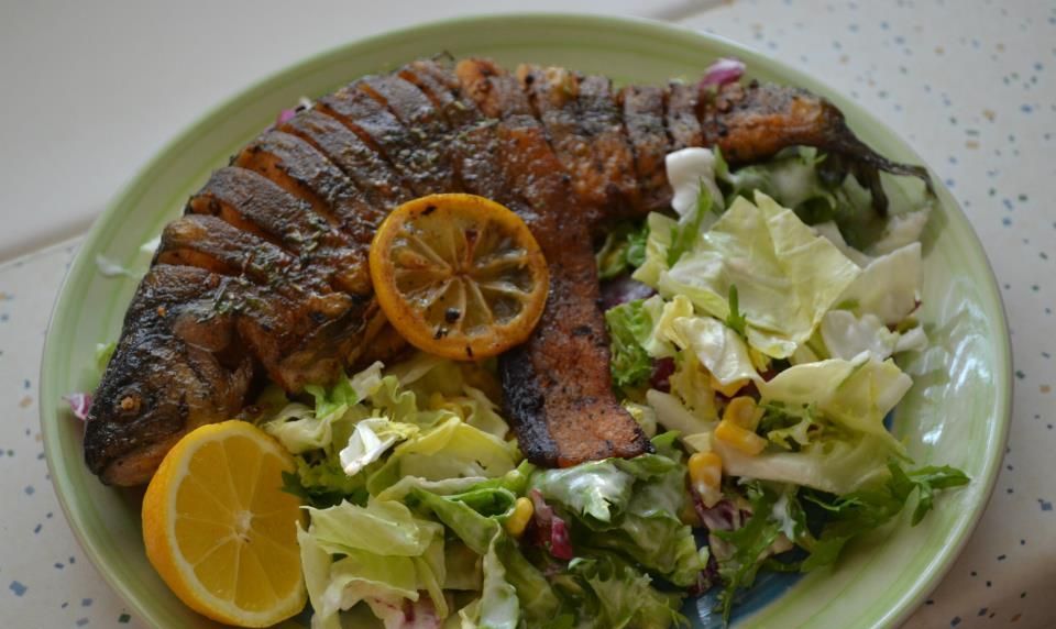 Házilag füstölt pisztráng (rendeléskor frissen sütve), ropogós salátákkal