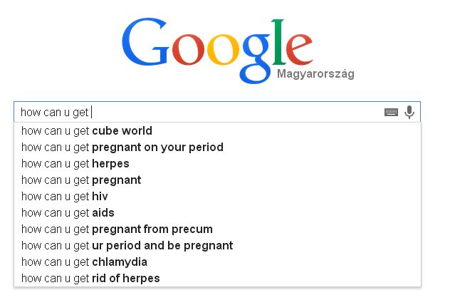 Szóval, beírtam hogy, "how can u get" azaz "hogyan kaphatsz" majd egy sor nemi betegséget listáz ( herpesz, HIV, AIDS, klamídia). Nagyon hasznos, sokak számára nem ismert, új szolgáltatása a google-nek, átveszi a felvilágosítás terhét a szülőkről és iskoláktól! Hamarosan magyarul is elérhető a szolgáltatásuk!