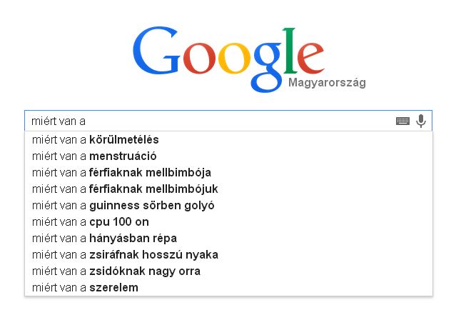 Namost, ez egy sok az egyben keresés. Hasznosabbnál hasznosabb dolgokra kínálja a választ nekünk a mindentudó google. Fontossági sorrendben kezdem, végére hagyva a senkit nyugodni nem hagyó kérdést. Szóval ha beírod, hogy "hogy miért van a", megtudhatod, hogy miért van a