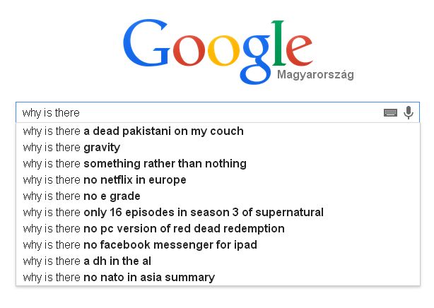 Na most, el tudja valaki képzelni azt az élethelyzetet ( ?vagy lemaradtam valamiről? ) , amikor arra a kérdésre keresi valaki a választ a google-ben, hogy " why is there a dead pakistani on my couch " azaz miért van egy halott pakisztáni a kanapémon?
