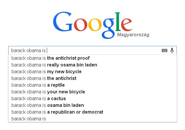 Meglepő, szerintem még maga Barack Obama sem tudta, hogy a google szerint ő az új "biciklim" és "valójában ő Osama Bin Laden" is.