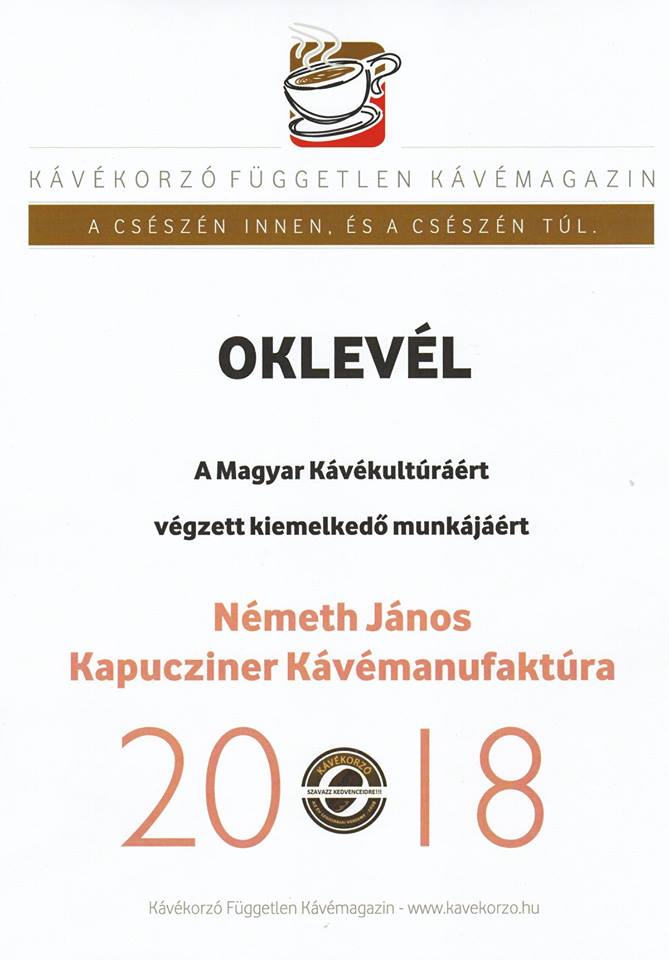 A szakmai zsűri, Németh János kávépörkölő mestert a "A Magyar Kávékultúráért végzett kiemelkedő munkájáért" díjjal jutalmazta.