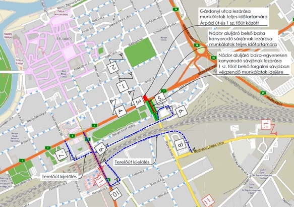 A társaság közölte: a kivitelezés idejére a Szent István út forgalma egy sávra szűkül a belváros irányába. A Gárdonyi utca Szent István út és Árpád út közötti szakaszát lezárják, azt csak az Árpád út felől hagyják nyitva a célforgalom számára. A Nádor aluljáróból ideiglenesen nem szabad majd balra kanyarodni, illetve a Gárdonyi utca felé sem lehet egyenesen menni. Az aluljárón át közlekedők számára terelőútként az Eszperantó utat és a Révai utcát jelölik ki a Baross híd, illetve az Aradi Vértanúk útja irányába. A korlátozások a Nádor aluljáróból jobbra, a Szent István útról az aluljáró irányába, valamint a Hegyeshalom – Budapest irányba közlekedőket nem, vagy csak minimálisan érintik.