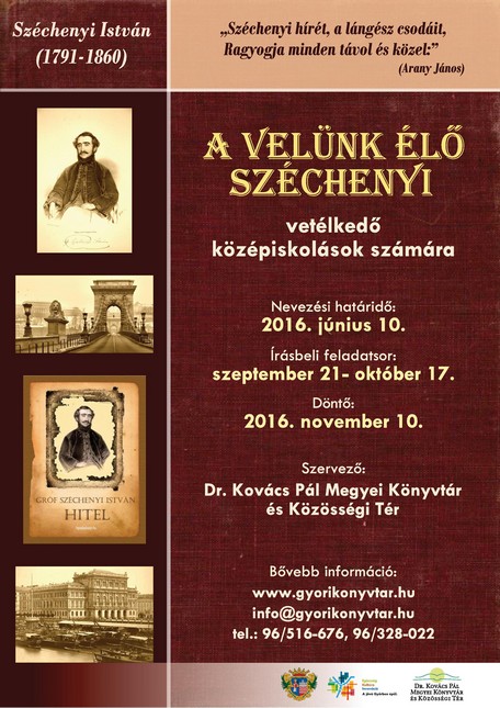 Gróf Széchenyi István születésének 225. évfordulója alkalmából a Dr. Kovács Pál Megyei Könyvtár a Széchenyi Emlékévhez kapcsolódóan történelmi vetélkedőt hirdet Győr-Moson-Sopron megye középiskolásai számára.