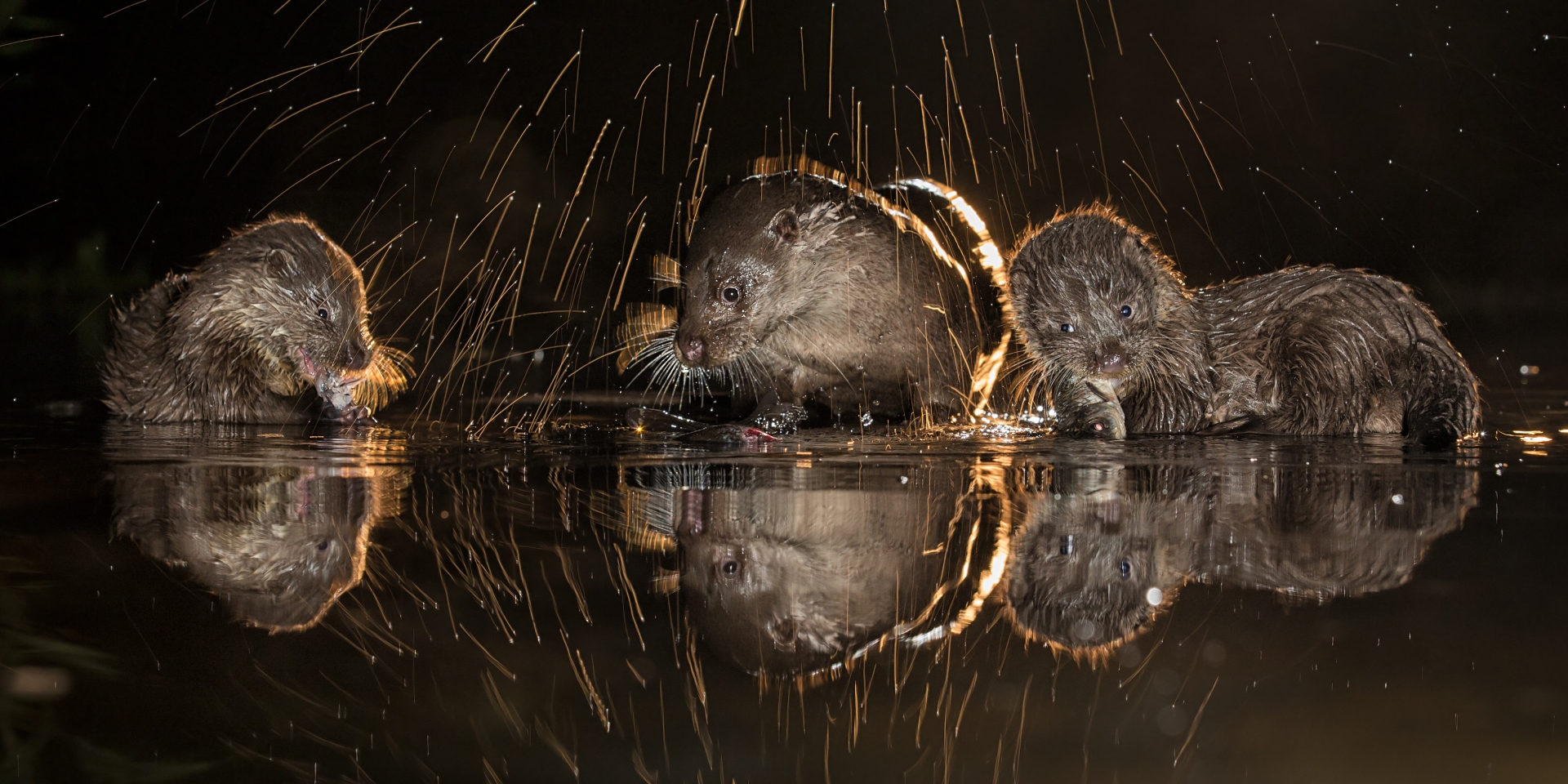 Kép: Máté Bence - A naturArt Az Év Természetfotósa versenyen, 2015-ben Máté Bence: Tűzijáték című fotója nyerte az első díjat az Emlősök viselkedése kategóriában. A vidramama tanítja halászni kicsinyeit.