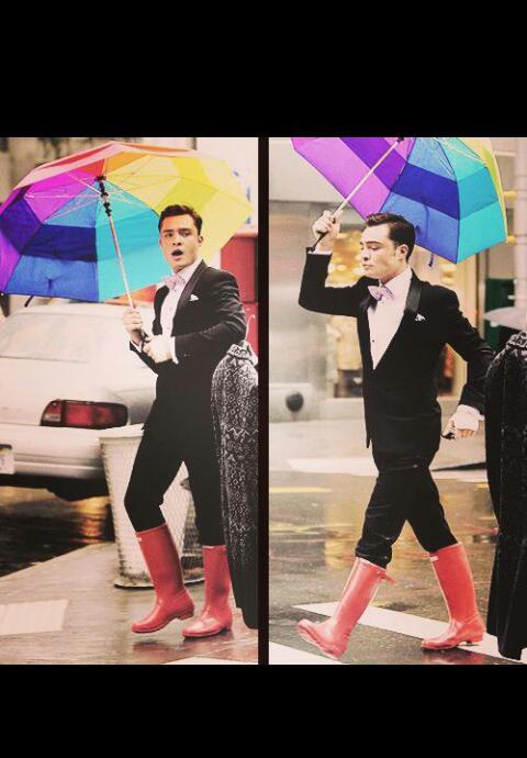 A Pletykafészekből híressé vált Ed Westwick a férfiideál, a tökéletes pasi megtestesítője, amit főként rosszfiú, de mégis romantikus karakterének köszönhet, érdekes öltözetet választott. A sorozatban Chuck Bass-t játszó színész közel se imidzséhez méltó szerelésben mutatkozott: a rózsaszín gumicsizma és a színes esernyő, öltönnyel kombinálva elkeserítő látványt adott. A világhálón terjedő kép valószínűleg a forgatási helyszínen készült és az esőtől így védekezett a sztár, na de akkor is..