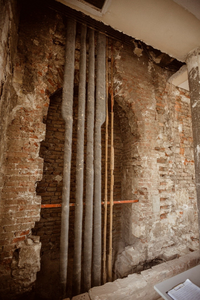 A terem alatt lévő előcsarnok falai pedig olyan Hauszmann-kori oszlopokat rejtettek, melyeket feltehetően az 1950-es évek végén falaztak be. A kutatás másik fontos eredménye, hogy a második emeleten, a déli barokk ablakból átalakított Hauszmann-kori átjáróban megmaradt a gipszstukkó egy része, valamint a cementmozaik padlóburkolat lenyomata. Ezek a feltárt építészeti részletek nemcsak a palota építéstörténetét árnyalják, hanem önmagukban is építészettörténeti értékűek.