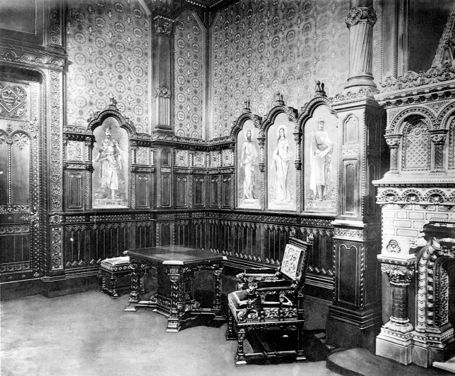 A Szent István-terem falait Árpád-házi királyokat és szenteket ábrázoló Zsolnay-pirogránit képek díszítették. A helyiség kandallóját tűzálló, mázas kerámiával burkolták, amelyre Strobl Alajos Szent Istvánról készült mellszobra került. A 220 centiméter széles és 465 centiméter magas kandallót a pécsi Zsolnay Porcelánmanufaktúrában több mint egy év alatt reprodukálták eredeti méretében, színében és anyagában.
