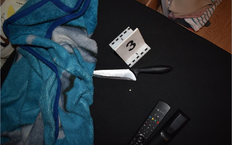 Pár perccel később visszaosont a házba, közben a terasz asztalán lévő kést valamint a sokkolót magához vette, és ágytakarója alá rejtette. Épp a telefonját kereste, amikor férje - kezében egy másik késsel - megállt a szobája küszöbén, és felesége irányába mozdult. A minden bátorságát összeszedő és félelmét legyőző sértettnek sikerült a férfi kezéből kivenni a kést, a szemetesbe dobta és kimenekült a házból. Útja először az orvosi ügyeletre, majd a rendőrségre vezetett.