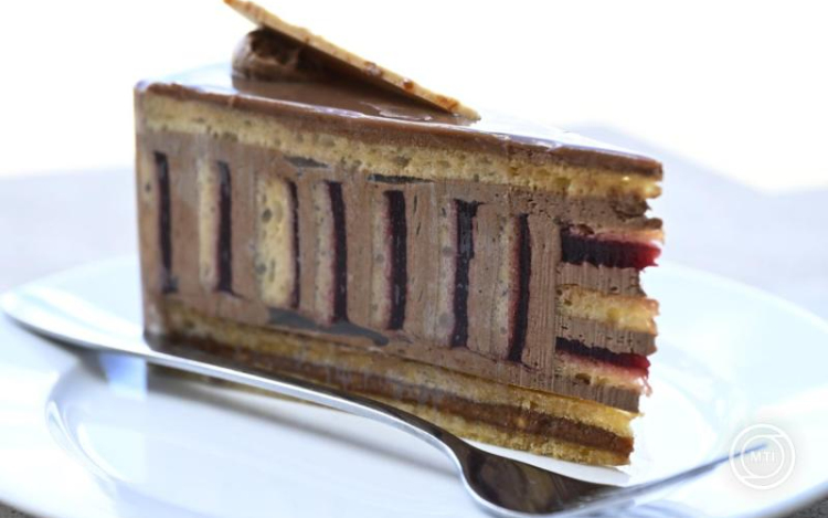 A vágási felület, a függőleges rétegrend különleges vizuális élményt ad, a meggy íze és a kellemes savak a csokoládé lágyságával és a karamell karakterével különleges gasztronómiai élvezetet nyújtanak.