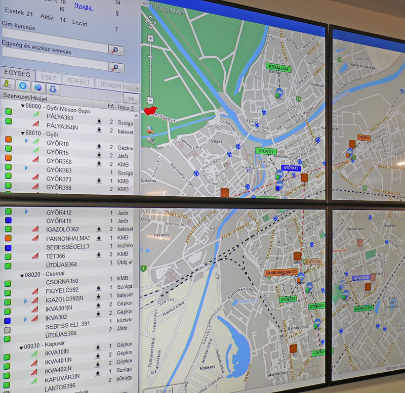 A hatalmas monitorokon éppen a szolgálatban lévő rendőrök mozgása követhető
