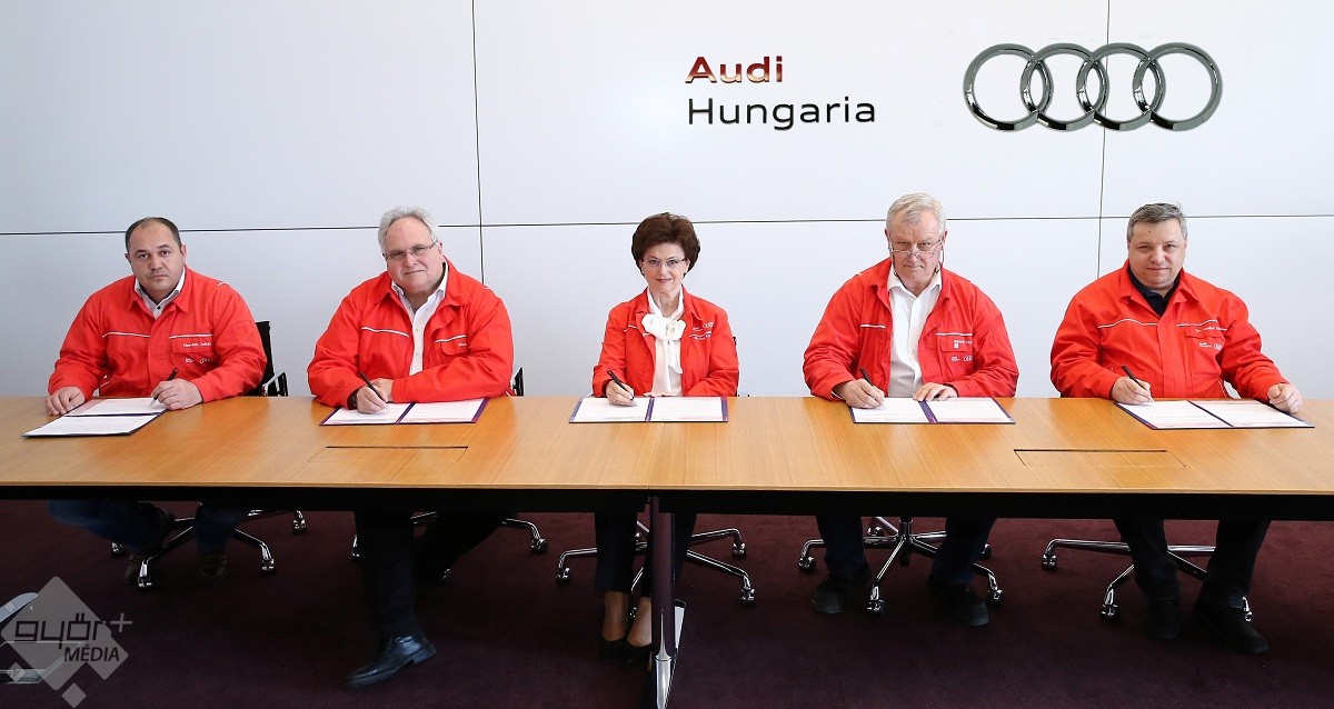 A megállapodást Dr. Knáb Erzsébet, az AUDI HUNGARIA Zrt. személyügyért és szervezetért felelős igazgatósági tagja, valamint Németh Sándor, az Audi Hungária Független Szakszervezet elnöke írták alá.