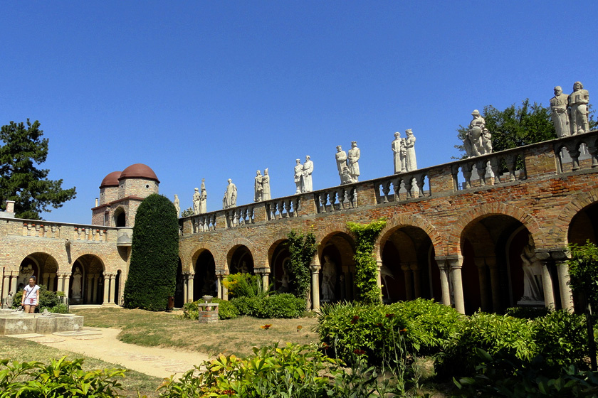 A százoszlopos udvar várfalai alatt 103 oszlop áll. Az elegáns franciapark a lakótornyokat és a központi épületet köti össze. Az árkádsor tetején párosával történelmi alakok szobrai állnak.