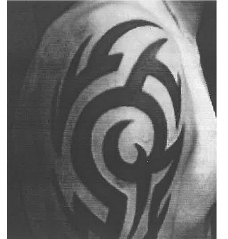 A tettes bal felkarján az alábbi képhez hasonló nonfiguratív, vonalkás elrendezésű tetoválás volt látható: