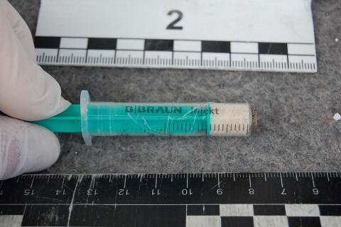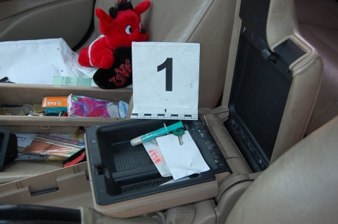Az egyenruhások a gépkocsi csomag és utasterét átvizsgálták, majd a könyöktámaszból egy fecskendőt foglaltak le. A műanyag tárolóeszközben bruttó 14 gramm kristályos állagú kábítószergyanús anyag volt. A férfi az intézkedők kérdéseire nyugtalanul felelt, majd a zsebéből lefoglalt, szintén fecskendőben tárolt bruttó 14 gramm drogról beismerte, hogy „pikó”, amiből korábban fogyasztott. A tiltott szer használatát a vele szemben alkalmazott kábítószer gyorsteszt pozitív eredménye is megerősítette.