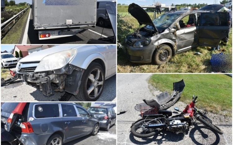 - Az M1-es autópályán, Budapest felől Hegyeshalom irányába haladt Seat típusú személygépkocsijával egy 29 éves román állampolgár június 3-án 9 óra körül. A 134-es kilométerszelvény közelében, az úton folyó munkák miatt lassító, majd megálló 61 éves kerekegyházi férfi által vezetett Volvo típusú személygépkocsi mögött nem tartott megfelelő követési távolságot, és annak neki ütközött. A karambolt követően a Volvo egy előtte lévő, 35 éves nő által vezetett Volkswagen típusú gépkocsinak csapódott, amely ennek hatására nekisodródott az előtte várakozó, 54 éves román állampolgár Renault típusú kistehergépkocsijának. Az eset során két felnőtt és hat gyermek sérült meg.