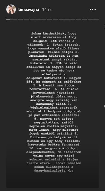 Nemrég felkerült Andy Vajna tárgyainak katalógusa a Nagyházi Galéria és Aukciósház honlapjára. Vannak egészen olcsó darabok is, bárki licitálhat az egykori filmügyi kormánybiztos kedvenc holmijaiért. Vajna Tímeától a jelek szerint sokan kérdezik, hogy miért adja el néhai férje cuccait, az özvegy egy Instagram-sztoriban válaszolt erre.