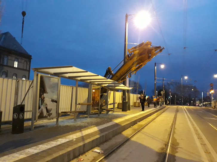 Szilágyi Máté, az index.hu videósa a Margit híd budai hídfőjénél járt, amikor valami nagy zajt hallott. Odament, és akkor látta, hogy egy munkagép rádőlt az egyik villamosmegállóra, küldött is róla két fotót.