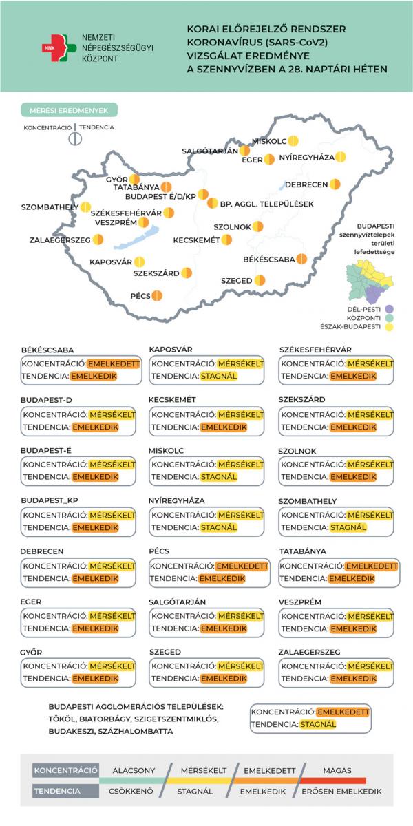 Mint írják, a 28. héten a vizsgált 22 mintavételi helyből 17-ben emelkedés figyelhető meg. Öt mintavételi ponton stagnál a szennyvízben a koronavírus örökítőanyagának koncentrációja, csökkenés egyik vizsgált városban sem tapasztalható.
