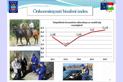 Csizmadia Gábor rendőr dandártábornok úr beszámolt az önkormányzatok, a lakosság körében végzett elégedettségi vizsgálat eredményéről. Ez a mutató - a bizalmi index - 2015. volt a legmagasabb, a 2012. évi 3,86-ról 4,25-re emelkedett.