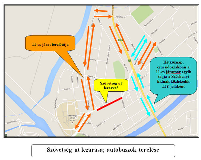 A 11, a 11A, 2B jelű buszjáratok is terelőútvonalon közlekednek: a 2B jelű járat a Hédervári út – Zemplén utca útvonalon közlekedik majd. A 11 és 11A jelű autóbuszok a Hédervári út – Zemplén utca – 14-es sz. főút – Bácsai út útvonalon fognak közlekedni. Fontos információ, hogy munkanapokon a reggeli és délutáni csúcsidőszakban a 11-es járatok páronként váltakozva fogják használni a Jedlik-híd és a Széchenyi-híd – Schwarzenberg út útvonalat. Ez azt jelenti, hogy amelyik 11-es járat Bácsa irányába a Jedlik-hídon közlekedik, Bácsa felől a Széchenyi-híd – Schwarzenberg út – Teleki út – Szent István út útvonalon fog visszajönni 11Y jelűként. Ugyanez igaz lesz fordítva is: amelyik járat Bácsa irányába a Széchenyi hídon közlekedik 11Y jellel, visszafelé az Egyetem-Jedlik-híd útvonalon fog Bácsa felől visszajönni 11-es járatként.