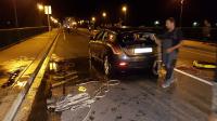 Ekkor kötelekkel a part két oldaláról gyalogosan, illetve a tűzoltó csónakkal megkezdték az autó vontatását, leúsztatását a Rába kettős hídig. Innen tudta a daru a híd hídfőjére állva kiemelni az autót a folyóból, amit előtte hevederekkel alaposan átkötöttek, rögzítettek a tűzoltók. A járművet kicsivel éjfél előtt helyezte a daru a hídra, amit tulajdonosa egy autómentővel elszállíttatott.