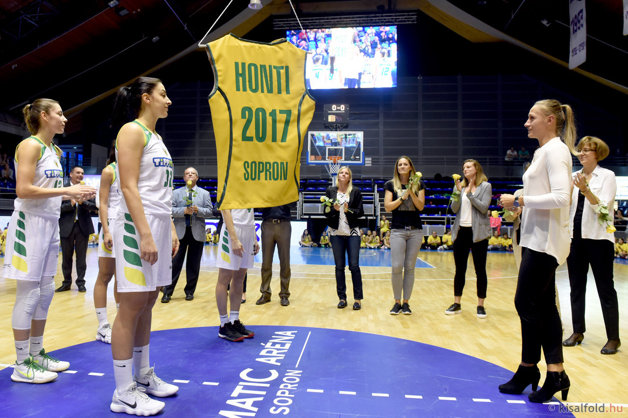 A Sopron Basket - BEAC- Újbuda NB I-es női kosárlabda mérkőzés előtt felvonták a bajnoki és kupagyőztes zászlót a Novomatic-aréna légterébe, majd Honti Katát búcsúztatták korábbi edzői, játékostársai.